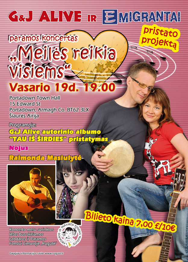 Nepaprastai gera buvo gauti žinią iš ilgamečių „Rugutės“ draugų Jurgos ir Gintariaus Petkų, gyvenančių Šiaurės Airijoje. Vasario 19 d. jų iniciatyva bus organizuojamas koncertas „Meilės reikia visiems“, kurio metu susijungs širdys, žodžiai, muzika, dėmesys artimui, meilė vaikams ir kilnumas. Koncerto metu surinktos lėšos bus skirtos mažiesiems ligoniukams.