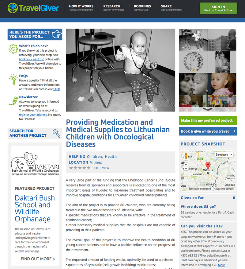 2013 m. lapkritį mus pasiekė elektroninis laiškas iš Australijos: kelionių portalo TravelGiver.com įkūrėja ir direktorė Kimi Anderson pakvietė labdaros ir paramos fondą „Rugutė“ prisijungti prie pasaulio organizacijų, kurių projektai skelbiami šiame kelionių portale, būrio.